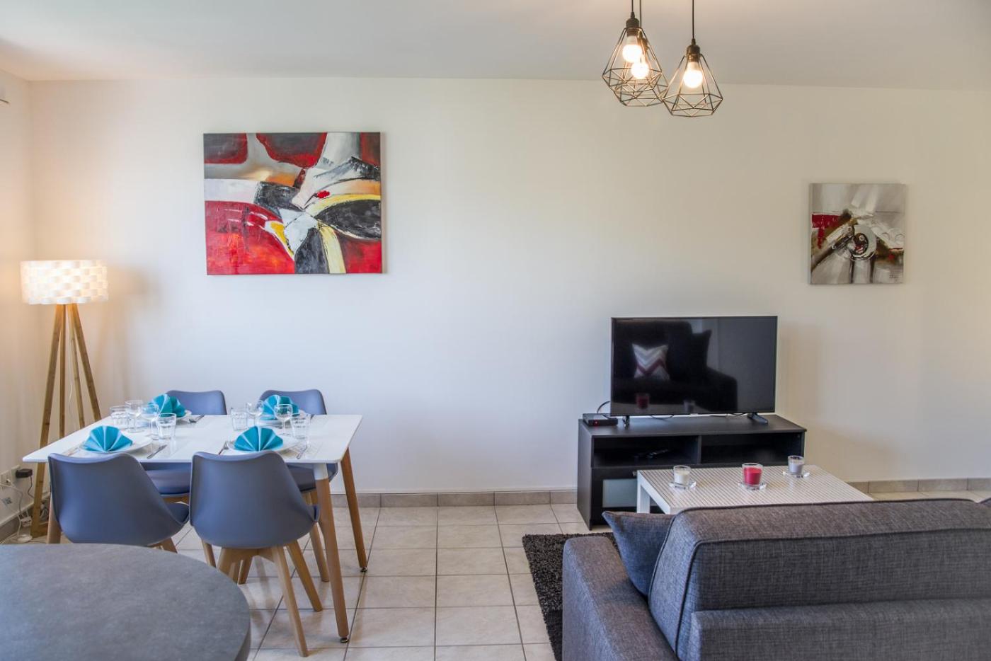 Appartement 1 Chambre. Boasting a private entrance, this apartment comes with 1 living room, 1 separate bedroom and 1 bathroom with a bath and a shower. Guests can make meals in the kitchen that features a stovetop, a refrigerator, a dishwasher and kitchenware. This wheelchair accessible apartment has a washing machine, a seating area with a flat-screen TV and a roll-in shower. The unit has 2 beds.