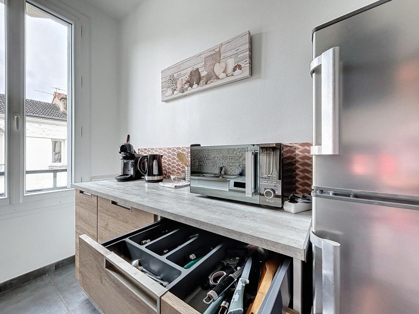 Appartement 1 Chambre. The fully equipped kitchen has a stovetop, a refrigerator, a microwave and a toaster. The spacious apartment features a washing machine, a private entrance, a coffee machine, a dining area, as well as a TV. The unit has 2 beds.