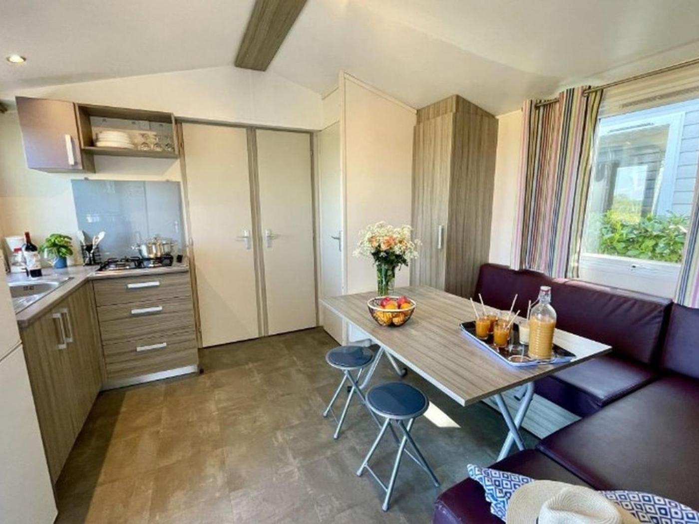 Mobile Home. Featuring 3 bedrooms and 1 bathroom, this mobile home offers a living room and terraceyou can relax. A kitchen equipped with a refrigerator, kitchenware and a microwave is available for cooking and storing food. The mobile home offers a private entrance, a coffee machine, a dining area, as well as outdoor furniture. The unit has 6 beds.